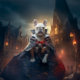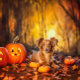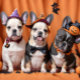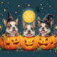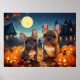 Bedårande franska bulldogpuppar, Halloween byscen, färgrik illustration, clipart-samling, digital konst.