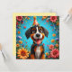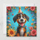 En glad tecknad hund som bär en festhatt och en halsband, omgiven av färgglada blommor och festlig konfetti, fångar en känsla av glädje, firande och lekfullhet i en livlig komposition.
