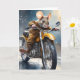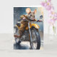 Söt mus i brun jacka och byxor på motorcykeltur på detta tomma vykort.
