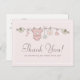 Gästerna på baby shower-festen kommer att älska detta rosa tackkort med babykläder på tvättlina och fåglar som bär dem.