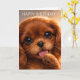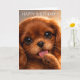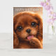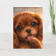 Bedårande Ruby Cavalier Spaniel-kort. Spanieln slickar sin tass i en söt pose.