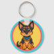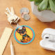 Illustration av en glad serietecknad hund med uttrycksfulla ögon, iförd en dekorativ halsband, och sittande mot en färgrik cirkelbakgrund. Lämplig för husdjursinspirerade designs, barnkonst eller lekfulla grafikdesigner.