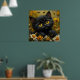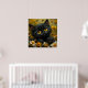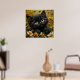 En svart kattunge med ljusa ögon sitter omgiven av gula prästkragar och surrande bin, vilket skapar en förtrollande scen med en fantasifull och lekfull stämning.
