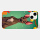 Bedårande tecknad hund som sitter lyckligt mot en festlig bakgrund. Hunden har stora, uttrycksfulla öron och ett glatt uttryck, med en ljusbrun päls och en tydlig vit fläck på bröstet. I bakgrunden finns en glad julscen med gröna och röda dekorationer