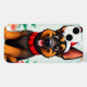 En bedårande, tecknad tysk schäferhund sitter glatt och lycklig. Hunden har en festlig röd-vit tomtehatt och ett matchande rött halsband. Den har en bred, lycklig glimten i ansiktet som visar upp sin lekfulla personlighet.