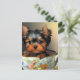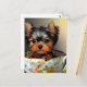 Bedårande vykort med AI-renderad digital målning av en Yorkie (Yorkshire Terrier) valp i en fin blomsterdekorerad tekopp.