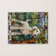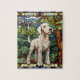 Roligtens pussel med en Bedlington Terrier-Hund som är artificiellt skapat i ett fönsterläge av nedfläckad glas.