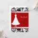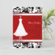 Formell inbjudningskort för möhippan som göras i en svart, damastast mönster för vit, på det bästa och nedersta. En älskvärd bröllopsklänning på ett dekorativt stativ dekorerar vänster sida av inbjudan, med en rött bakgrund och textområde. Diagram av tittar bandet för vit det satäng gränsar det bästa och nedersta av textområdet. Skräddarsy texten för att passa dina bröllophändelsebehov.