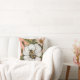 A throw pillow that has a cute bee gathering pollen on some flowers with an peach pink back round.