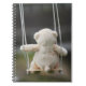 Een knuffel beer die op een schommel zit vanaf zijn rug gezien en in beweging is. Een speels beeld van een speelgoed beer in een speeltuin situatie. Geschikt voor kinderkamer of voor een dromerige sfeer waarin zachtheid en kinderlijke fantasie welkom is. Een zachte uitstraling in zomers plaatje dat illustratief dromerigheid weergeeft.