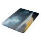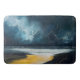 This dramatic abstract seascape captures the charged stillness just before a storm breaks. Dark, turbulent clouds roll heavily across the sky, painted in deep shades of navy, slate blue, and charcoal, while fine golden lines crack through the atmosphere like distant lightning. Below, the sea lies restless yet restrained, its pale, reflective surface meeting a glowing strip of golden shoreline that feels both calm and foreboding.