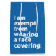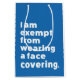 Många människor bär masker och andra täckningsmaterial från ansikte för att skydda sig mot COVID-19 och liknande infektioner. I vissa delar av världen finns det ett rättsligt krav på bära av dem i vissa områden. Alla kan dock inte bära en mask. Vissa människor är undantagna av hälsoskäl eller andra skäl. Barn ges ofta undantag. Även astma, andningssvårigheter, ångest och många andra villkor rekommenderas att inte bära ansikte masker. Syftet med den här utformningen är att klargöra detta för alla runt om i er. Texten är tydligt stater: "Jag är befriad från att bära ett ansikte-omslag".