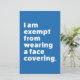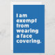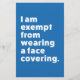 Många människor bär masker och andra täckningsmaterial från ansikte för att skydda sig mot COVID-19 och liknande infektioner. I vissa delar av världen finns det ett rättsligt krav på bära av dem i vissa områden. Alla kan dock inte bära en mask. Vissa människor är undantagna av hälsoskäl eller andra skäl. Barn ges ofta undantag. Även astma, andningssvårigheter, ångest och många andra villkor rekommenderas att inte bära ansikte masker. Syftet med den här utformningen är att klargöra detta för alla runt om i er. Texten är tydligt stater: "Jag är befriad från att bära ett ansikte-omslag".