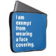 Många människor bär masker och andra täckningsmaterial från ansikte för att skydda sig mot COVID-19 och liknande infektioner. I vissa delar av världen finns det ett rättsligt krav på bära av dem i vissa områden. Alla kan dock inte bära en mask. Vissa människor är undantagna av hälsoskäl eller andra skäl. Barn ges ofta undantag. Även astma, andningssvårigheter, ångest och många andra villkor rekommenderas att inte bära ansikte masker. Syftet med den här utformningen är att klargöra detta för alla runt om i er. Texten är tydligt stater: "Jag är befriad från att bära ett ansikte-omslag".