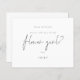 Minimal förfrågan om svart skript, blomma. Ett budgetalternativ som är prist med 4,5 x 5,6 tum. Kortet SEMI GLOSS 110 lb CARD LAGRAR som är standardalternativet (tjockare för inbjudningar) Kuvert är ett extra som tillval och är något större än kortets storleka. Enkel stil i klassiskt svartvitt för att ställa denna viktiga fråga. Flower Girl är i ett skript i snyggten. Text- och bakgrundsterminen färg kan ändras om du vill förbättra kostym i bröllop genom att anpassa ytterligare alternativ.