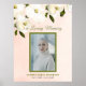 Denna vackra begravningsblomma eleganta kvinnliga välkomstskylt med vita blommor, ett foto av din älskade i grön ram, deras namn och livets datum. Bakgrunden till detta minnesmärke I levande minne är blekt persikorosa.