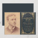 En vintage blå dödsfallsinbjudan ("Livets firande") som rekommenderas för en man. I den vänstra halvan finns ett utbytesbart sepia-fotografi från äldre tid. I den högra halvan är texten skriven i en dekorerad barock förgylld ram, på en mörkblå bakgrund. Namnet är skrivet med kalligrafisk stil, resten med versaler. Meddelandet "Vänligen anslut er" är välvt ovanför resten av texten.