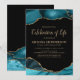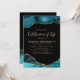 Anpassningsbar minnesstundsinbjudan med en stilren svart bakgrund, eleganta teal marmorerade agat-kanter och en modern mall för firande av livet som enkelt kan anpassas. Alla teckensnitt, storlekar och färger kan ändras genom att klicka på länken för ytterligare anpassning efter personlig anpassning.