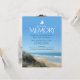 Meddela att din älskade passerade och detaljerna kring firande i deras minnesstund med den fredliga vita duvgrafiken med blå himmel och strand och sanddyner bakgrund och inbjudan till fotominnesservice. Anpassa till din plats och namn om din älskade osa- och annonsinformation och ditt favoritfoto på andra sidan. Sarah Trett originalfoto och design för www.mylittleeden.com