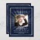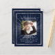 Ett tvåsidigt program för elegant. En mörk blått bakgrund, en faux silver tittar ram och ett fotomatutrymme. Ljusstrålar bakom fotot. Anpassa och lägg till namn, data och din text.