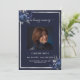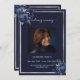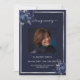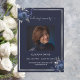 Ett tvåsidigt program för elegant. En mörk blått bakgrund, en faux silver ram, blå blommigtar och ett fotomatutrymme. Anpassa och lägg till namn, data och din text.
