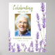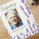 Begravnings skylt välkomstskylt med lila lavendelblommor, ett foto av din älskade, deras namn och datum.