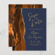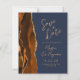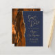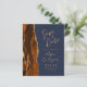 Den lämnat kant i eleganten i den moderna bröllopsinbjudan har en rost eller bränd orange vattenfärg agate gräns trimmad med faux guld glitter. Anpassadet kombinerar ett modernt handskriftsskript, en tryckplåt och ett kursivt typsnitt med guld-färgad mot en marin blå bakgrund. Den omvända sidan har en matchande bränd orange och guld agate-design.