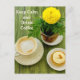 Det här mysiga vykortet visar en varm kopp kaffe tillsammans med en söt efterrätt och en ljusgul blomma, mot en naturlig grön bakgrund. Det enkla och upplyftande budskapet ”Keep calm and drink coffee” tillför en avkopplande och glad ton, perfekt för vardagliga ögonblick.