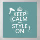 Det här står "Keep Calm and Style On", i stil med den klassiska "keep calm"-affischen. Det finns krusiduller och spiraler på bokstäverna, och silhuetter av saxar och en hårtork. Detta är en populär design bland människor inom alla aspekter av skönhetsbranschen, och gör också fantastiska presenter.