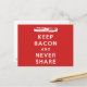 Behålla Bacon och aldrig . Ska vi ta med oss bakomåldern lugnt? ALDRIG! Mitt, mitt, mitt! Baserat på Världskriget Två Poster "KEEP CALM AND CARRY ON". Vit text och bild över en röd bakgrund. "BEHÅLLA BACON OCH ALDRIG ".