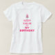 Den här skjortan visningar texten "BEHÅLLA LUGN IT'S MY BIRTHDAY" i rosa teckensnitt. Ovanför texten finns en rosa treskiktad kaka. Kakan har svart rosett band mellan lagrar, två rosa hjärtan överst och sitta på ett silver tårtstativ.