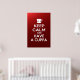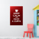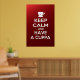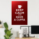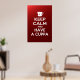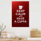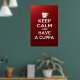 En poster som innehåller en variant av Håll lugn och fortsätt, Behållans Lugn och ha en kuppafil i vit text och ljusröd bakgrund