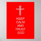Med inspiration från det brittiska Världskriget II poster denna utformning, "Behållans Lugn och fortsätt", ett vitt kor och texten "Behållans Lugn och Trust God".
