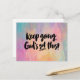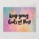 Modern typografi-design med ord i svart kalligrafi-skript, "Behålla Going. Guds Har "Det här!" på färgfull vattenfärgsbakgrund.