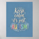 Spelande pastellskript på blå spådomar i bakgrunden "Behålla lugn, det är bara AUTISM" med dekorativa blomningar. Den här upplyftande designen främjar autismmedvetenhet, ADHD-förståelse och acceptans av neurologisk mångfald, uppmuntrar tålamod, delaktighet och empowerment med ett lätt budskap.