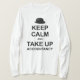 En T-shirt med en variation på lugnen Behålla och fortsätt med temat "Behålla Lugn och upptagning av bokföring", tillsammans med en bowlareare hatt-motiv i stället för det vanliga krona.
