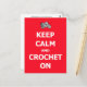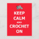 Ett vykort av "Behålla lugn and crochet on", på rött och dekorerat med en svart och vit härva av ull och två röda kronor krok.