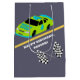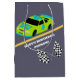 Skapa en presentsäck för personlig som är perfekt för för behov 4, temat 4e födelsedagen party. Den här väskan illustrerar en bil i stil tävling i lagrar i i grönt och ljusblått ljus. Bilen nummer 4 har sloganen för NEED 4 HASTIGHET på huvan. Bilden ställs in mot grått tävling-spårbakgrunden och åtföljs av två styrda flaggor. Påsen är redo att vara personlig med din slogan i fet vit stil. Bilden och meddelandet visas både på vägens framsida och baksida.