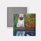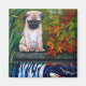 Söt knölpuppen sitta vid sidan av en damm tittar vid en stor koi.