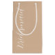 Presentera era dina bröllop-brudgåvor med den här lilla presentväskan som matchar ditt bröllopsfest färg-schema för ett trendig, beige färg, tillsammans med ett vitt, stiliserat skript som lyder "Bridesmaid".