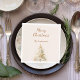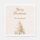 A soft beige background. Decorated with a snowcovered pine tree. Merry Christmas is written with an elegant hand-lettered style script. Personalize and add your family name