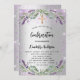 En modern, snyggt och glamorös inbjudan till bekräftelse, A faux silver tittar bakgrund med violet faux glitter, sparkler, lavendel blommigtar, blommor och eukalyptus greenergiy. Namn är skrivet med ett modernt handskript i stil. Anpassa och lägg till information.