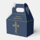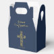 Modern bekräftelsetabell med guld kor på mörk blått bakgrund och handskript namn. Anpassa till namn, text och datum.