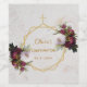 Denna eleganta blomstergemetriska design som rekommenderas för en flickas konfirmation har en geometrisk oregelbunden guldbård med blomsterbuketter i vinröda och vita peonior upp och ner över två guldfärgade sexhörningar som överlappar varandra, med ett guldkors högst upp. Bakgrunden är vit marmor. Barnets namn är skrivet med en elegant kalligrafisk stil; resten är skrivet med versaler. All text har en gyllengul färg, likt guldbården.