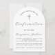 En enkel, modern bågformad, svart och vit, könsneutral bekräftelseinbjudan. Den har endast svart text på vit bakgrund. I den övre delen finns ett kors med välvd text ovanför. Tillfället och namnet är skrivna i skrivstil.