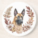 På denna underlägg placeras ett vackert porträtt i en belgisk Malinois-hund i centrum av en söt höstandekrans i tonerna på kanelbrunt, brunt och grädde. Allt placeras på en vit bakgrund.