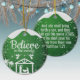 Believe in the wonder, Religious Holiday Ceramic Ornament with green star sparkle, Nativity Scene capturing the Christmas magic and joy of a Christian season. On the back, the sacred writing, Luke 2:12 states, "And this shall be a sign unto you; Ye shall find the babe wrapped in swaddling clothes, lying in a manger" all in customizable text, ready for you create your favorite bible verse in festive devotional design hanging decorations. Order your Christ teachings testaments today and make your custom inspirational doctrine keepsakes extra special with divine passages of the word of our Lord! 🎄⛪️