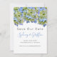 Bella blue blommigt spara-the-date platta kort med fyra linjer anpassningsbar text. Överst gör blåa och gult vattenområden ett söt gräns med all text tryckt på kraftens pappra, eller ändrar pappra och bakgrunden är vit, eller pappra färg. Namn är ljusblått.