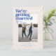 Belmont spara-the-date-kortet visar ett lodrät-foto som fångar parets innersta väsen i kärlek och skapar ett visuellt mittstycke som talar sitt tydliga språk. I det övre lämnat hörnet ger den feta förklaringen "Vi är gifta sig" strålkastarljuset. Direkt nedanför är parets namn delikaterat skrivet i en handskriven kalligrafi i stil, med en aning personlig charm och sofistikering. När man ser till mitten av grund, presenteras de viktigaste detaljerna i firande på ett behändigt sätt i ett litet, klassiskt serif-teckensnitt. Komen av datum, tid och plats för information går smidigt ihop och lovar en dag full av glädje och omhuldade stunder. Baksidan är en arbetsyta för ett annat vackert foto av paret, som ger en glimt in i deras gemensamma resa. Ett budskap om personlig, som paret har tänkt på, tillför en varm och intim beröring och inbjuder nära och kära att gå med i firande i sin union.