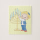 En söt liten pojke ljus en stor menorah för Hanukkah.